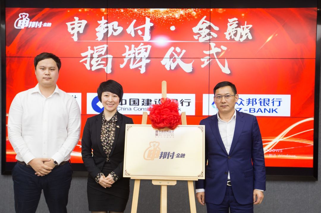 △随着申远集团总裁张兆平(右)、中国建设银行上海分行信用卡业务部总经理刘瀛(中)、众邦银行大客户金融事业部总裁张晓飞(左)揭开红布,“申邦付”正式成立启动