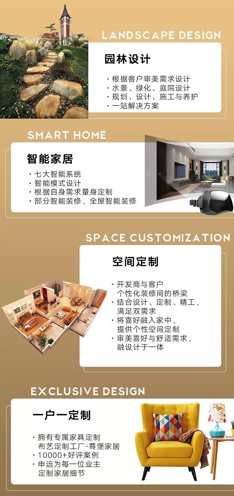 从园林设计、智能家居、空间定制到一户一定制,为您打造独一无二的专属,深入剖析客户需求,满足客户喜好,真正做到拎包入住,为客户创建美好生活。