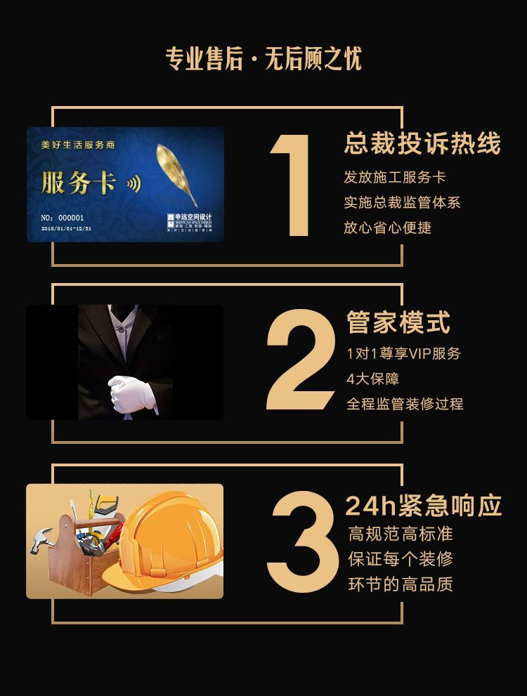 整装定制:拎包入住式装修服务,设计、材料、家具、软装、饰品、智能全配套,结合个性化定制,体现业主的个人品味与个性化需求,