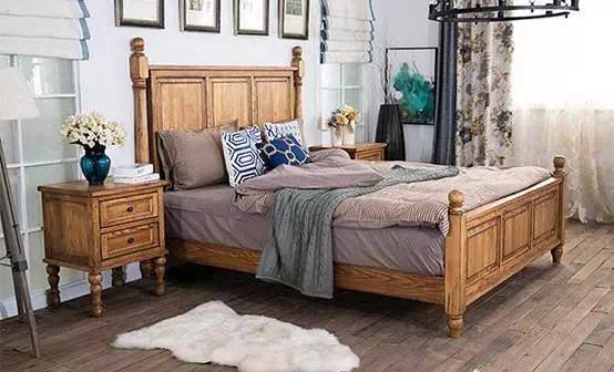 原木床和床头柜+海蓝花瓶+边框壁画+深色布品=复古实用美式主义