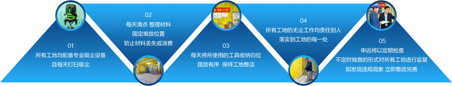 严格遵守申远施工工地形象标准,装修管家参与监督,专人专职清扫整理,好工地是好工程的关键。